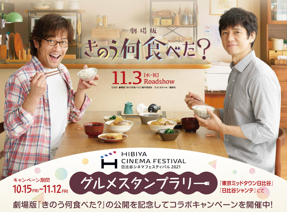 10月22日から開催する『HIBIYA CINEMA FESTIVAL 2021』では、劇場版「きのう何食べた?」の公開を記念して10月15日(金)~11月12日(金)の期間、日比谷シャンテと東京ミッドタウン日比谷の2つの商業施設でグルメスタンプラリーを開催します。