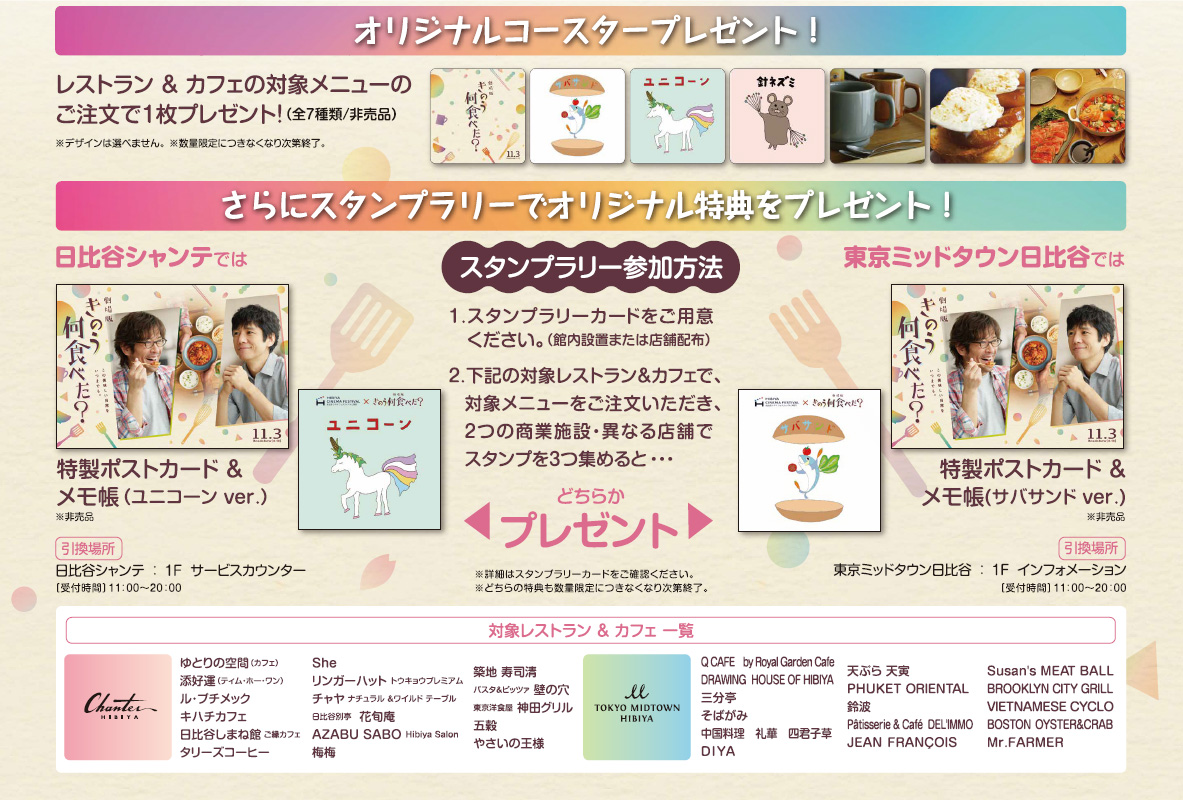 さらに、スタンプラリーで2つの商業施設(日比谷シャンテ・東京ミッドタウン日比谷)、異なる店舗でスタンプを3つ集めて頂くと特製ポストカード&メモ帳をプレゼントいたします。