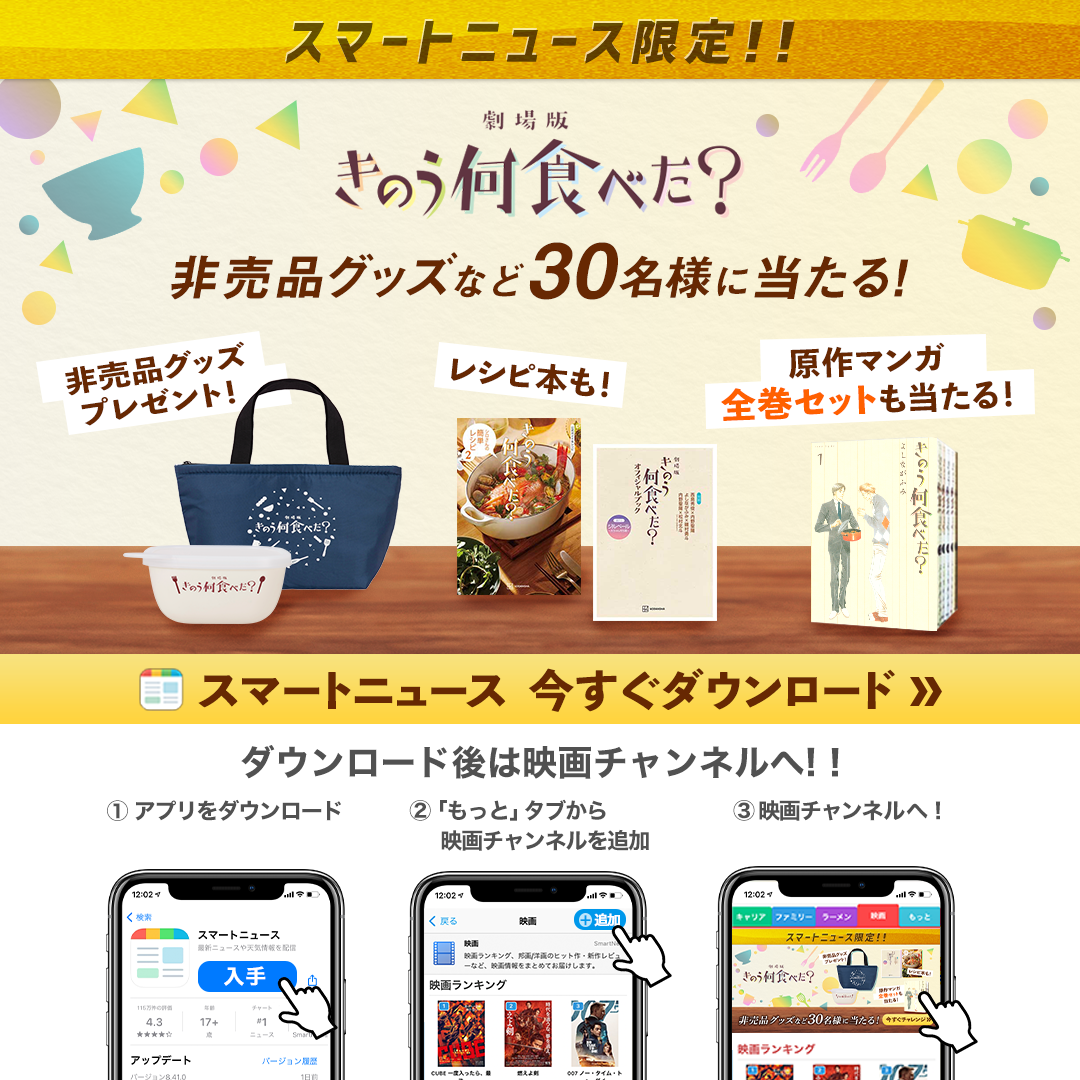 スマートニュース & 劇場版「#きのう何食べた?」の特別企画! 11月4日11時から11月18日10時非売品グッズや公式レシピ本など毎日プレゼント! スマートニュースをDLして、毎日プレゼント企画に応募しよう!